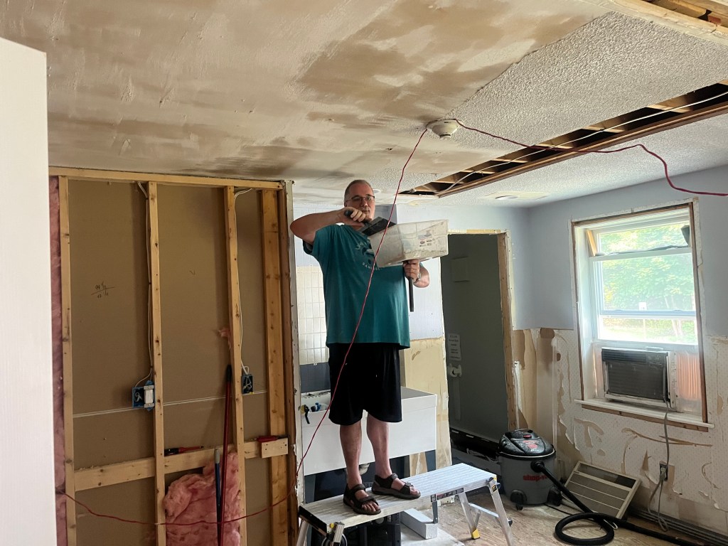 With the fire captain’s help we tried to reset the system to no avail. So the fire captain gave me instructions about how to clean the smoke detector. We got the alarm silenced (though we were unable to shut of the emergency strobes throughout the church) so I went home for lunch and to clean the chicken coop while Jody finished up the ceiling. Then I went back to the church and followed the instructions on cleaning up the smoke detector. It involved paper towels, Q-tips and a shop vac.