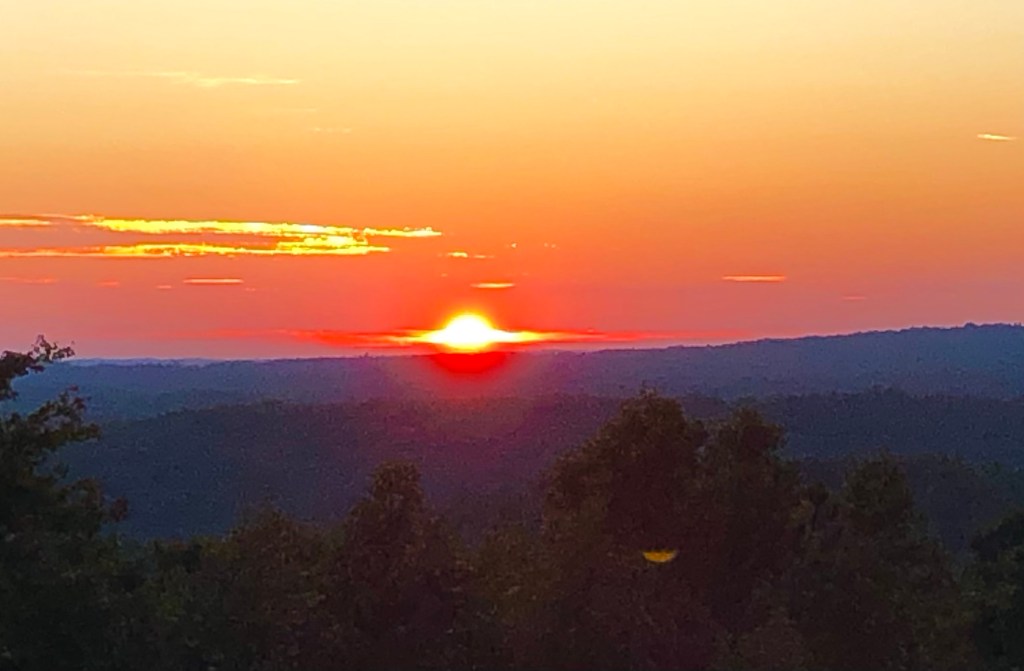 We visited with the Fraser’s until about 1 PM and then meet our way back up the plateau into the Cumberland Mountains to our cabin at Eden Ridge.Here is the sunset from our cabin deck.
