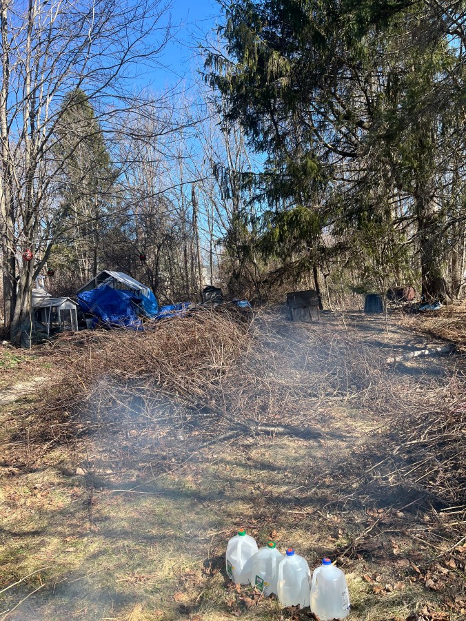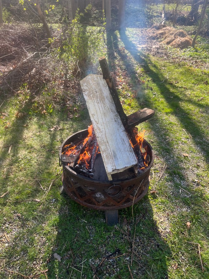 Those of you who have been following along know that as Spring breaks around us in all of its glory, here in New England, the projects are beginning. One of the many projects at the Vicarage is burning up a rather large pile of brush. Actually it is more like four large piles that are connected across the yard into one immense pile.